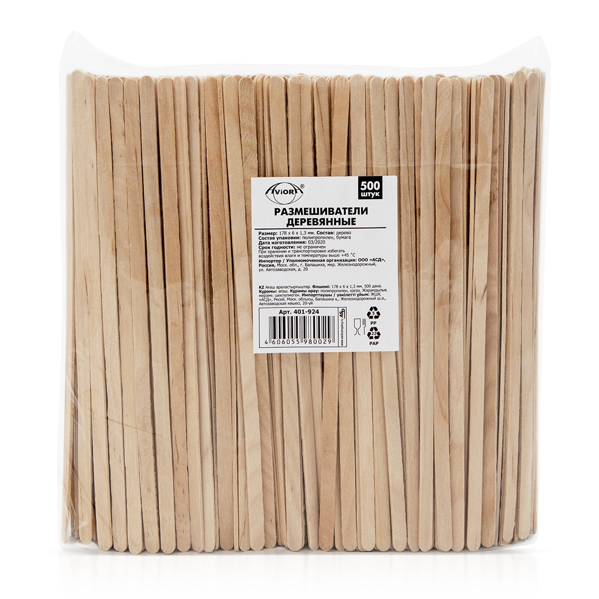 401-924 Размешиватели для напитков, деревянные, в индивидуальной бумажной упаковке, 178 х 6 х 1,3 мм